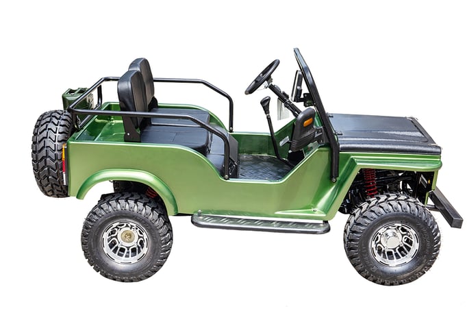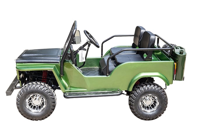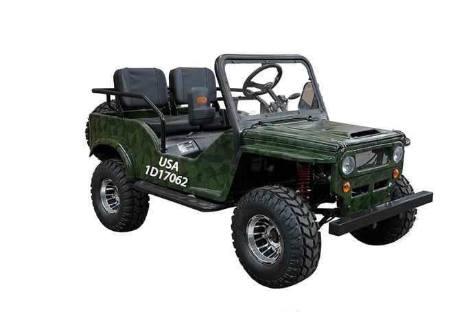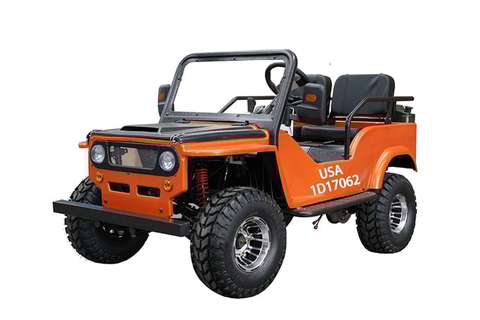 Front and rear wheels, windshield, steering column, seat, spare tire holder, gas can holder, seat bars, seat belts, battery |