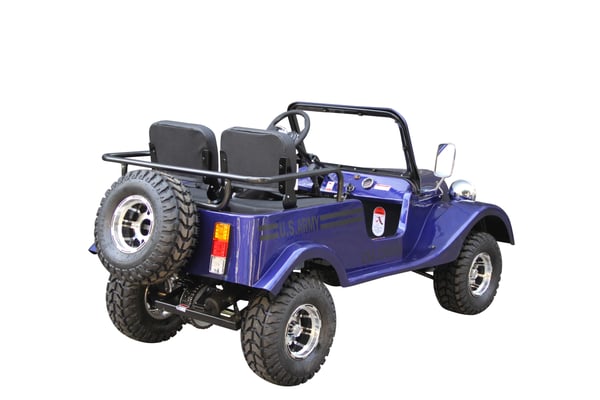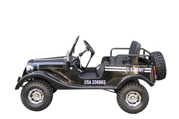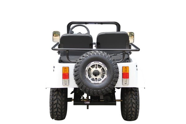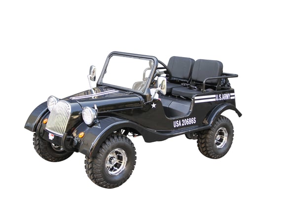 Front and rear wheels, windshield, steering column, seat, spare tire holder, gas can holder, seat bars, seat belts, battery